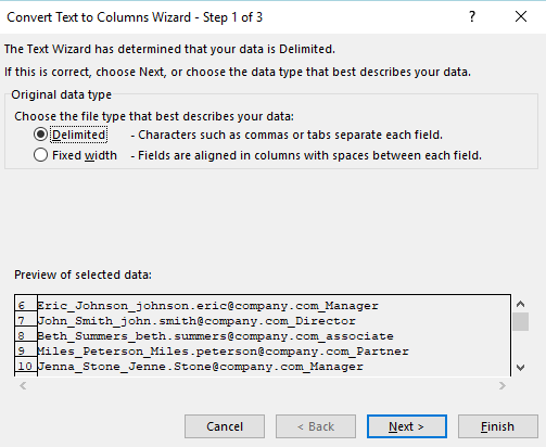This tool allows us to change text strings into separate columns easier to use. In this case each value is separated by a delimiter the underscore, choose the delimited option and click next.