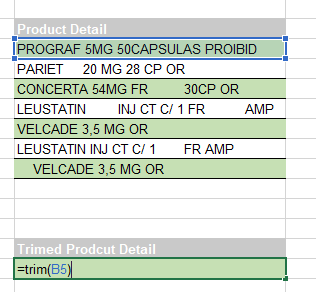 Open the sheet named Trim(), here we have rows of data that describe products. There are extra spaces between many of the letters and numbers in the data.