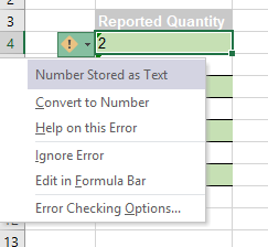In the arrow menu we have a function to convert the cells to numbers one by one. If a number is stored as text we cannot use some of the most common functions such as sum, or average. Consequently, the sum function in cell B11 returns zero.