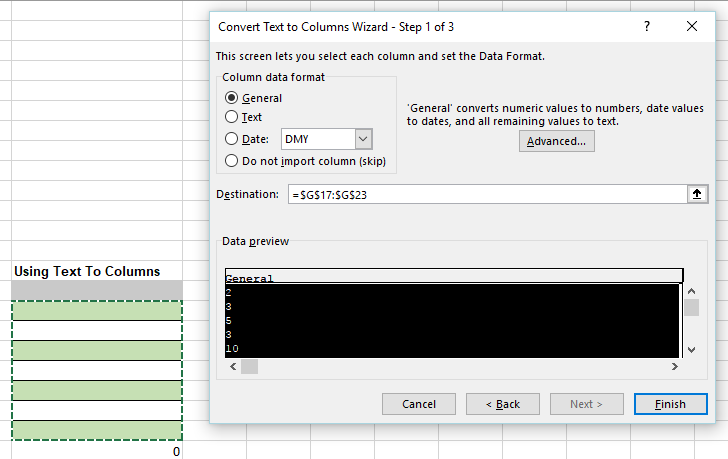 Select the raw data, click text to column from the data ribbon, choose delimited and click next. Uncheck Tab and other as we are only dealing with one piece of data. Click next. The text to columns function knows that the data is numeric. General converts numeric values to numbers, date values to dates and all remaining values to text. Choose the destination as our table below.