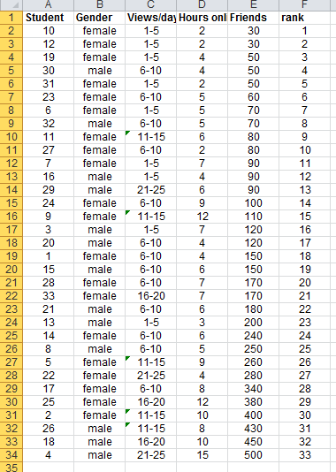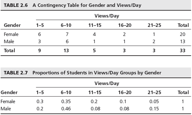 If we want to identify the number of students who are in the different categories of views/day by Gender in the facebook data. If we convert the data into the proportions of each views/day group for females and males, we obtain the result shown below in table 2.6: