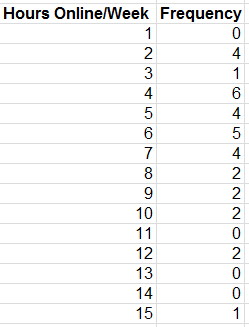 The mode is the observation that occurs most frequently. The mode can easily be identified from a frequency distribution or histogram. For instance in the Facebook data we can see that the largest frequency of hours online/week is 6, which corresponds to a value of 4 hours per week.