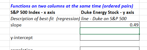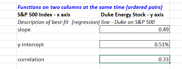 We look at two columns of data at the same time using functions to work on ordered pairs. Our X axis values are the S&P index and the Y axis are Duke Energy stock for the same month. Each ordered pair represents one month in time and two results.
