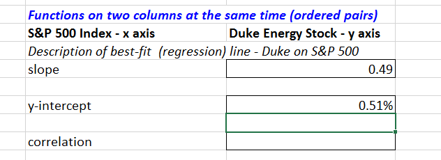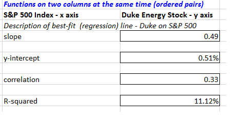 Next we would like to know on average did Duke Energy stock out perform the S&P index. One way to discover this is what would be the return from Duke Energy if the S&P index returns zero? For this we use the Y-intercept function.