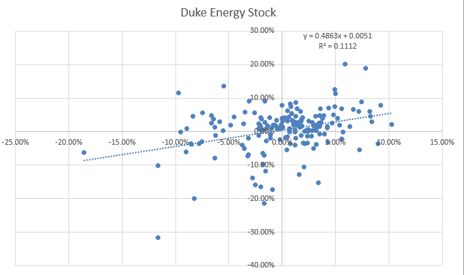 The R-squared for S&P 500 and Duke Energy shows the relationship between the stocks explains only 11% of the variability around the mean.
