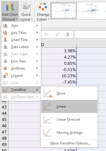 We can add descriptive statistics by choosing trendline linear from the charts design tab.