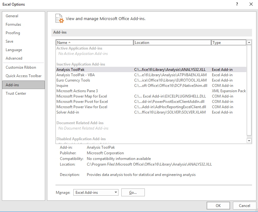 If it is not installed, from the File menu choose Options. In the Excel Options window choose Add-ins from the left side menu.