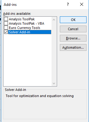 Click on the Go... button to manage Excel Add-Ins. Check the box beside Solver Add-In and click OK.