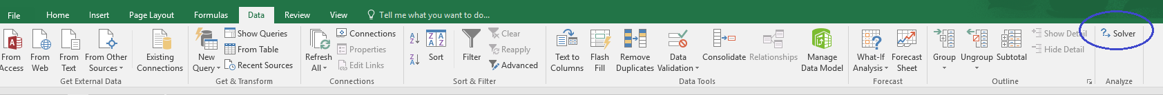 The Solver option now should be displayed on the data tab to the far right.