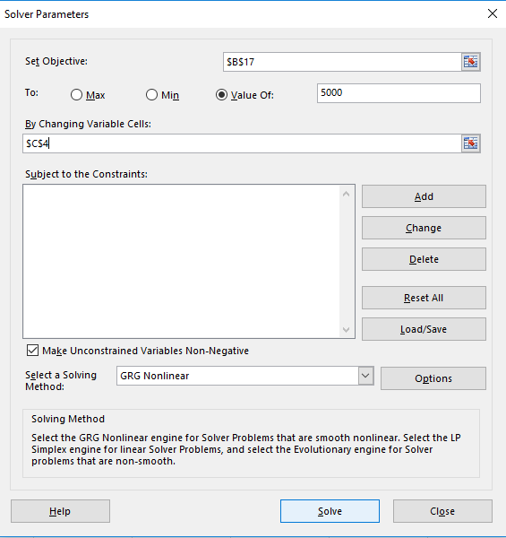 Click on the Solver option now. For this model we are building our objective is that the cell B17 is to have the value 5000 contained in it. This is to be acheived by changing variable cell C4.