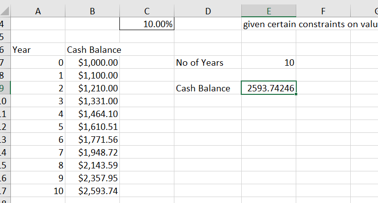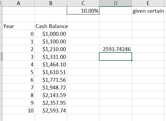 When we do repeated multiplication of the same thing by itself it is called An Exponent. In this case the 1000 initial balance is multiplied by the interest rate, the result is again multiplied by the interest rate and so on for 10 years in our example. So in a new cell if you entered the following formula you would get the same result of 2593.74 after 10 years of an interest rate of 10%