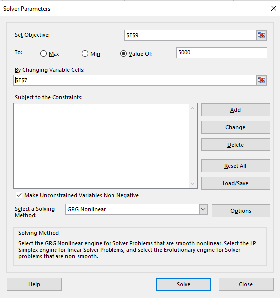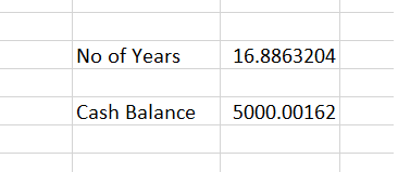 Next we use Solver again our objective is for cell E9 to have the value 5000 and we want solver to change cell E7 (number of years) in order to figure out the solution.