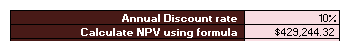 We must now enter the discount rate, in our case we will put in the value 10 into cell H26. This gives us an NPV of approxiately €429,000.