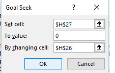 Excel will then automatically cycle through different values of an IRR to make the NPV equal to 0. The final answer Goal Seek came up with is 57%. (this answer is shown in cell H26 the discount rate) In other words, if the discount rate is 57% the NPV of the investment will be 0. You can copy the value from the discount rate cell into the IRR using goal seek cell.