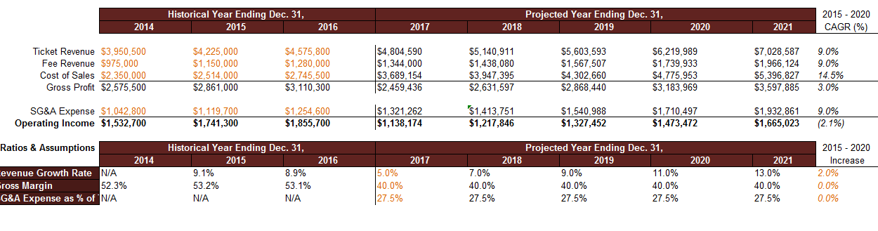 Here is a simplified version of a income statement. In orange are historical numbers for the Ticket Revenue, Fee Revenue, as well as Cost of Sales and SG&A Expenses from the past three years.