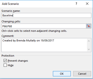 Lastly, there are also options to Prevent changes and Hide the scenario if you like. For our purpose, let's keep the default setting and click OK. Then, you will be taken to the final step of setting up the scenario, defining the value of each cell to change in the scenario.