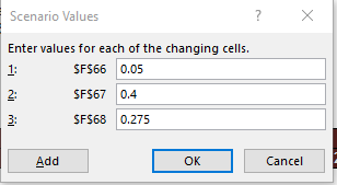 In the Scenario Values window, we need to update the values of the Changing cells for this particular scenario.