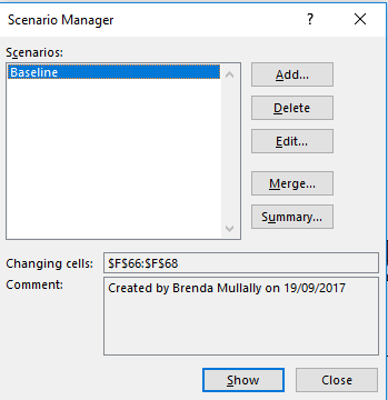 The numbers that are already in cell F66, F67, and F68 are the numbers we want to keep for the scenario, so we can simply click OK. That will take us back to our Scenario Manager pop-up window, so we can see the Baseline scenario that we just set up in the list of scenarios.