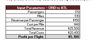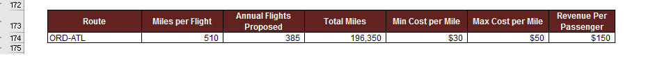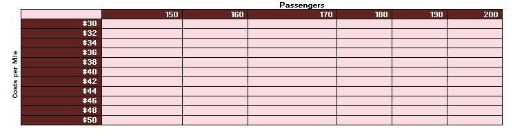 The operations team has determined the minimum cost per mile is $30, and the maximum cost per mile is $50, depending on the various market factors. The operations team has also provided estimates for the number of passengers per flight and the revenue per passenger. 170 and 150 respectively.