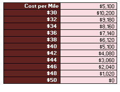 Notice that when cost per mile is $50, profit falls to $0. We've now demonstrated how to use a one way data table, to determine the range of outcomes given a variable input. In this case, cost per mile.
