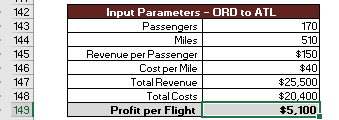 The inputs we are going to vary are passengers in cell C143, and cost per mile in cell C146. The objective formula, profit per flight, is in cell C149.