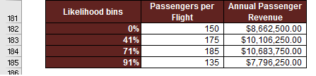 In column D of the likelihood bins table, we have calculated the annual revenue associated with each level of passengers per flight in column C.