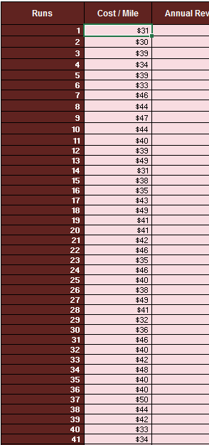 For each of the 90 profit calculations in column J, we'll have two random inputs, Cost per Mile in column H and Passenger Revenue in column I.
